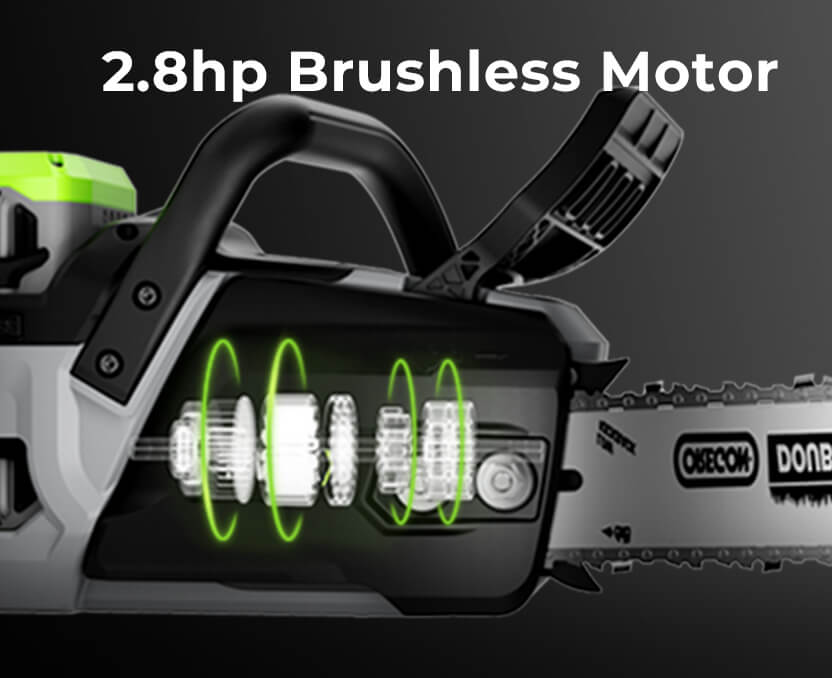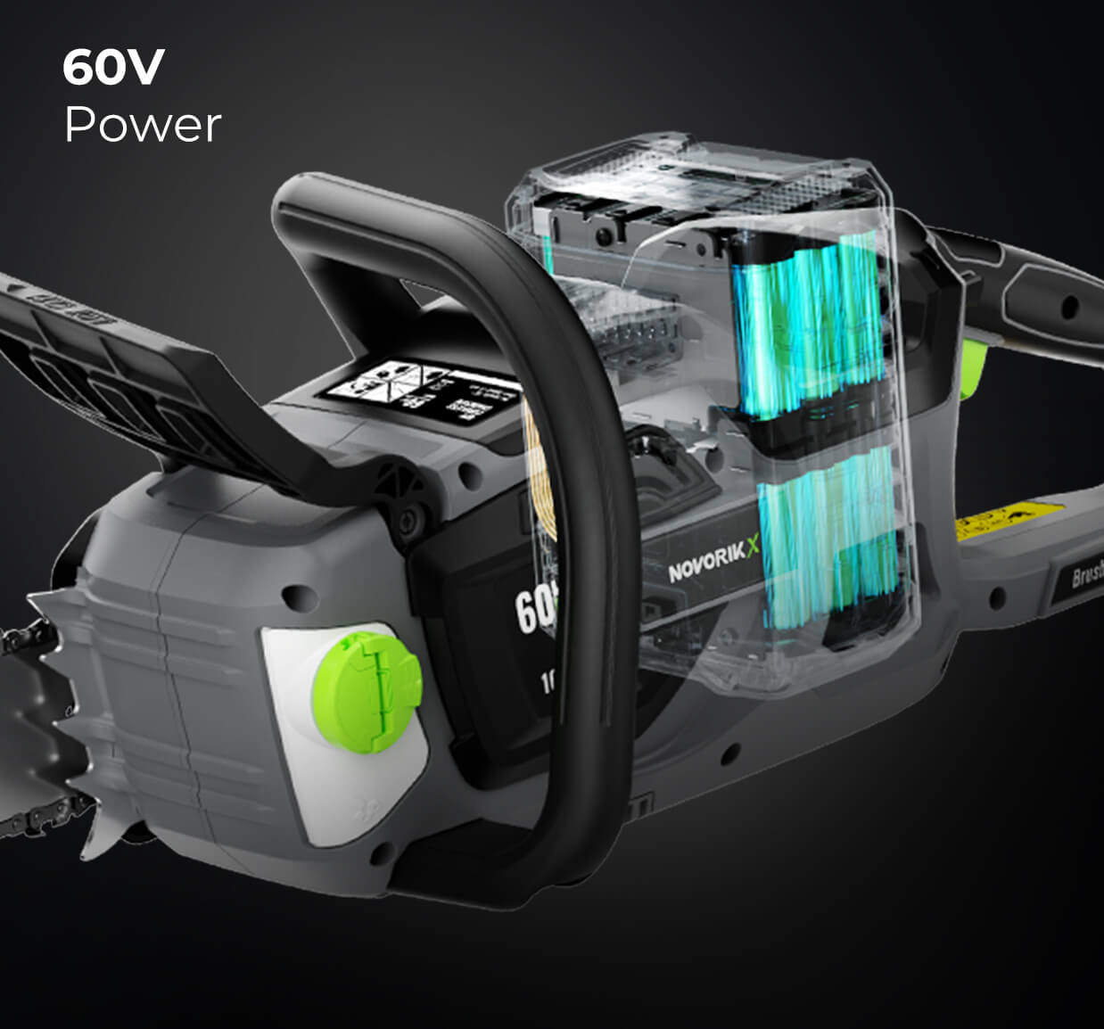 It uses a 60V high-voltage lithium battery, delivering 2.8 horsepower (2100 watts) of power, providing strong cutting force and easily handling various types of wood, including hardwoods and branches.